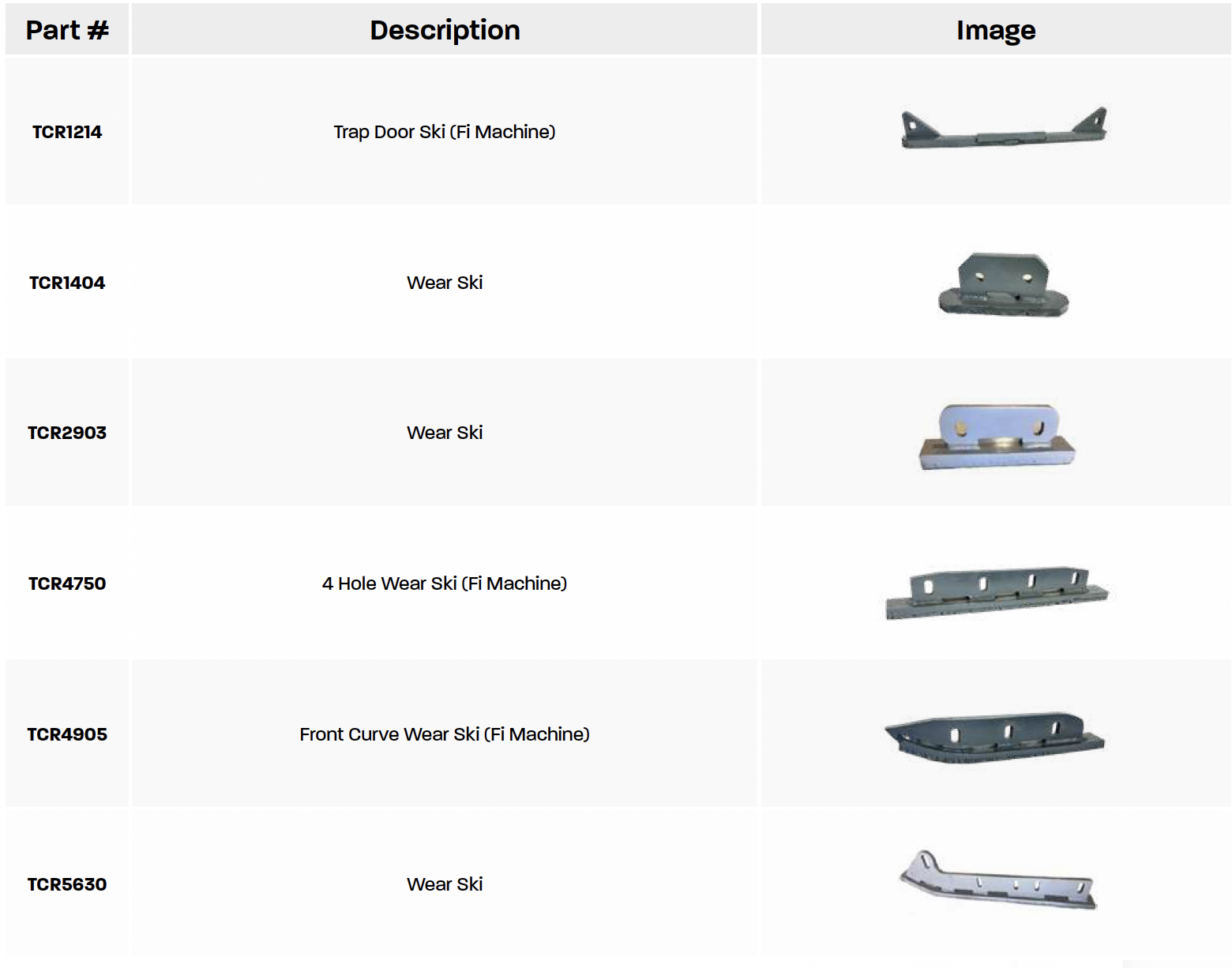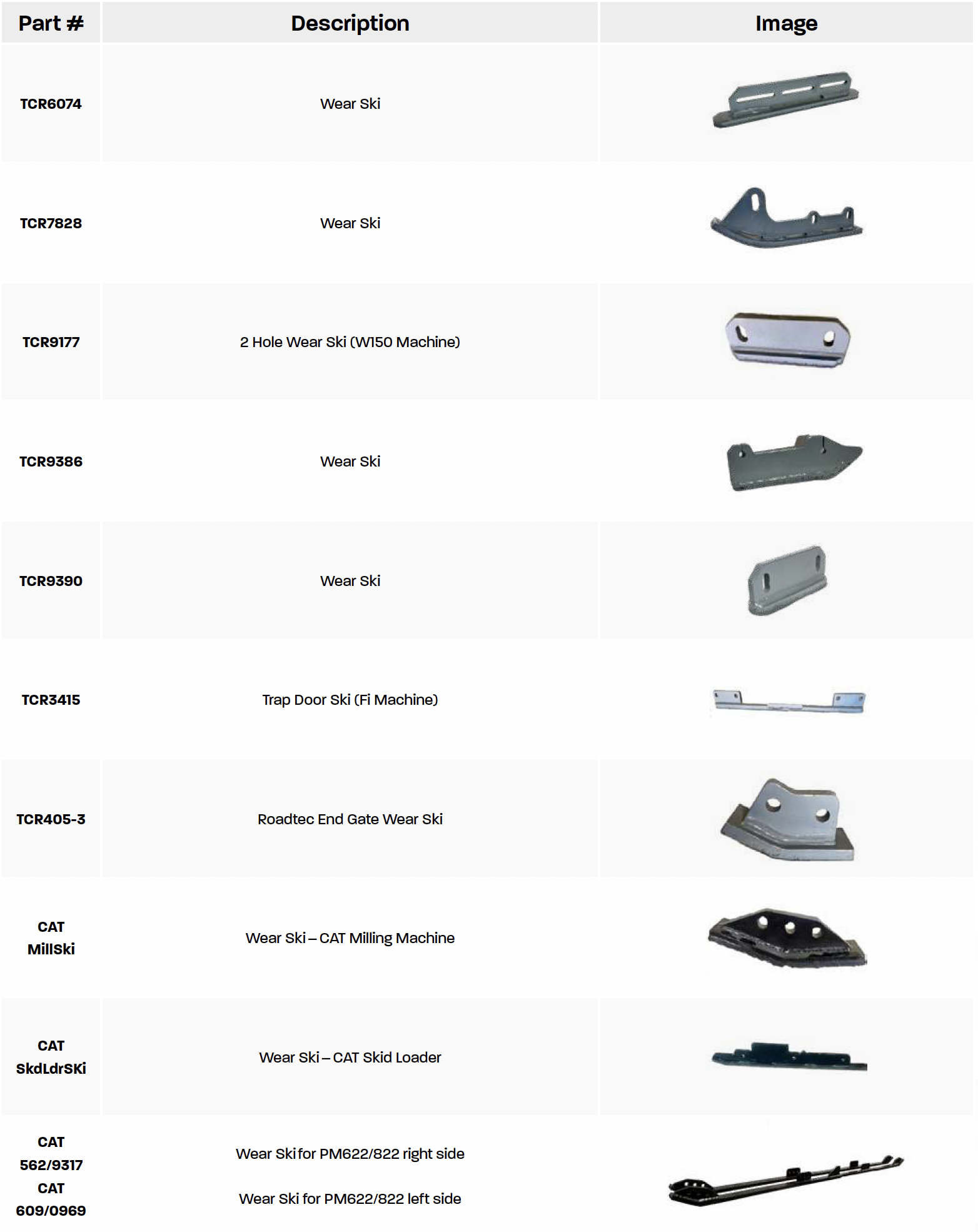 TC Recycling offers the wear skis for many different brands and models of machines. If there is a particular machine that needs a side ski, please inform your sales representative and we can build what you need.